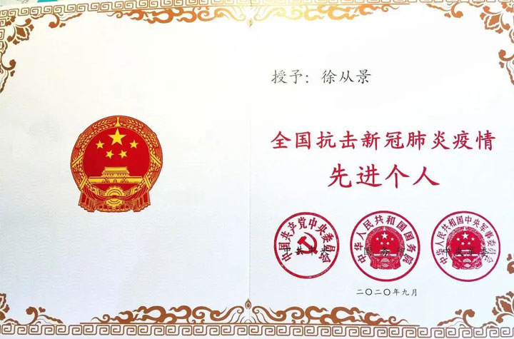 從醫35年,入黨30餘年,徐從景教授作為一名老黨員,一名黨員領導幹部,一名呼吸内科專家,在抗擊疫情的鬥争中,他第一批馳援武漢,最後一批凱旋歸來。不僅用精湛的醫術、高尚的醫德和無私奉獻的敬業精神赢得了患者和同仁們的交口稱贊,更用“不計報酬,無論生死”的大無畏精神和勇于擔當的使命責任感,展示了什麼是醫者初心!什麼是“我是黨員,我先上!”的高尚品格。