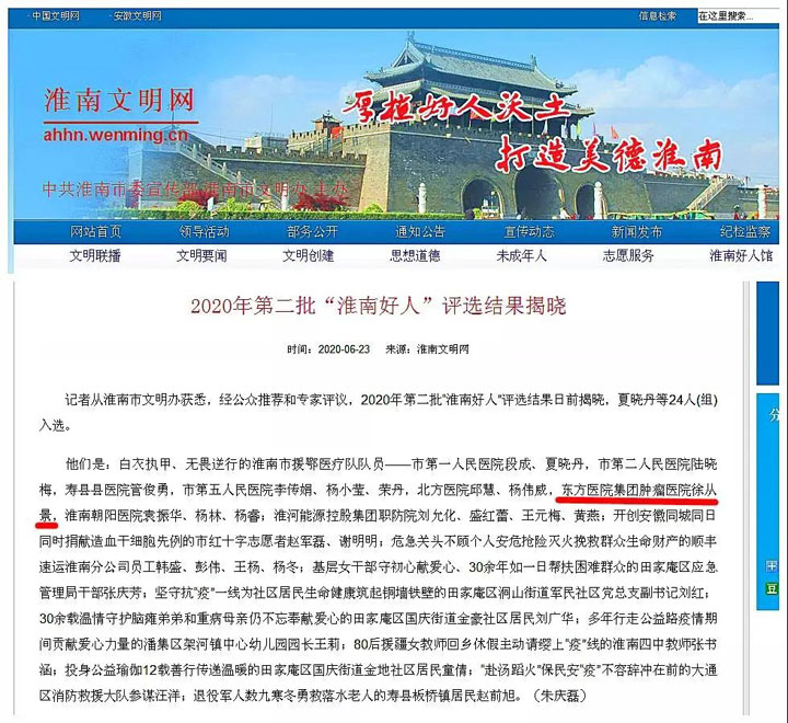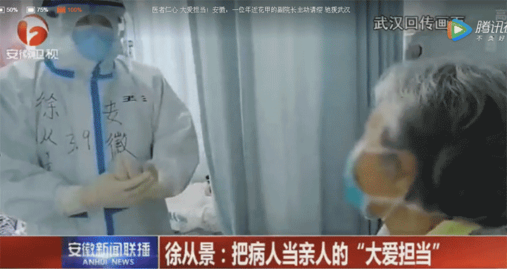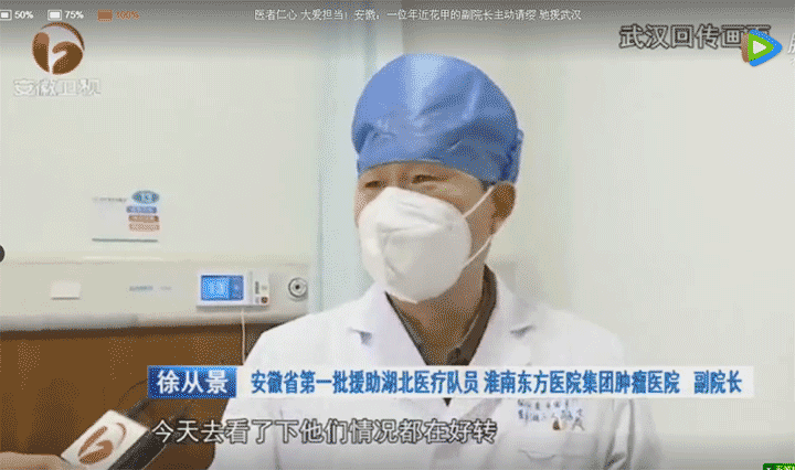 馳援武漢以來,徐從景教授忘我的工作精神和無私的奉獻精神得到了同行和患者的一緻贊揚。在安徽台播出的記者視頻連線采訪中,馳援武漢的安徽省抗疫醫療隊領隊汪天平特别點贊了徐從景教授。他說:“金年会体育腫瘤醫院的徐從景院長,他60多歲了,是淮南的十佳優秀黨員,我們當時還不知道他是院長。他天天查房從不休息,我們叫他休息,他講我就是來工作的,我就是為患者解決痛苦的。病人多治一個,他心裡就高興、就踏實。”