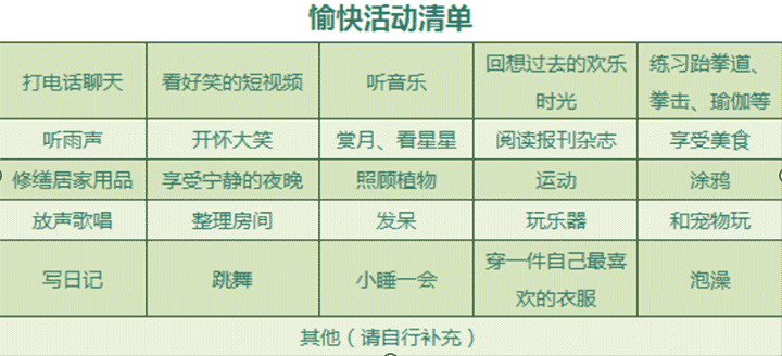 (1)盡可能多地列出愉快活動清單,即做哪些活動時自己會感覺到愉快?下圖清單僅供參考;