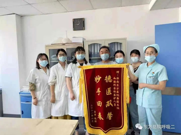 醫護人員對躺在層流床上的吳先生予以抗感染等治療,白細胞立刻增多,身體指标轉好,期間醫護人員時時予以關心和照顧。可剛有好轉,另一個煩惱又來了。原來,吳先生病房裡同住着一位80歲的老奶奶,家住農村得了腫瘤,身體耐受力差,堅持不讓開空調,炎炎夏日吳先生苦不堪言又無以言說……醫護人員馬上對吳先生進行勸慰,在治療逾3天其白細胞恢複後,将其調轉住進其他病房,問題迎刃而解。7天後,吳先生恢複出院,他和家人感激不過,特意定了一面錦旗,鄭重送到總院血液科。“德醫雙馨·妙手回春”的贊語是對醫護人員醫術醫德的高度肯定,同時感謝他們對患者反映問題給予及時周到的處理和細心耐心的解釋。