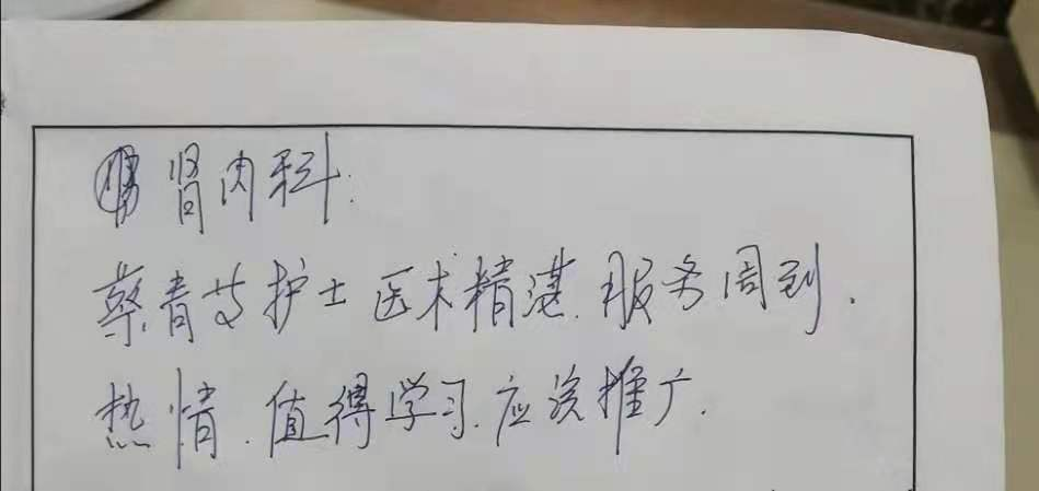 說到腎内科,很多人都知道,慢性腎髒病病人多數都有腎性高血壓,這也就意味着科室護士,特别是責任護士,每天需要對病人進行多次血壓測量。可腎病學科有很大一部分是血液透析患者,大都有動靜脈瘘,而瘘測手臂是不能進行測量血壓、靜脈輸液、靜脈采血等護理操作的。也就是說,使用内瘘透析的患者隻有一側手臂可以進行護理治療,如果瘘側手臂先輸液,患者便不能及時監視血壓。為了保證每個病人都能及時測量到血壓,蔡護士每天早早地來到科室,換上工作服後便開始為患者測量血壓,病人們看在眼裡記在心裡,因為此事科室病人對蔡護士一緻好評,今年4月20日,一名83歲的老病人,更是出院時不忘在病患意見薄上提名表揚蔡護士。