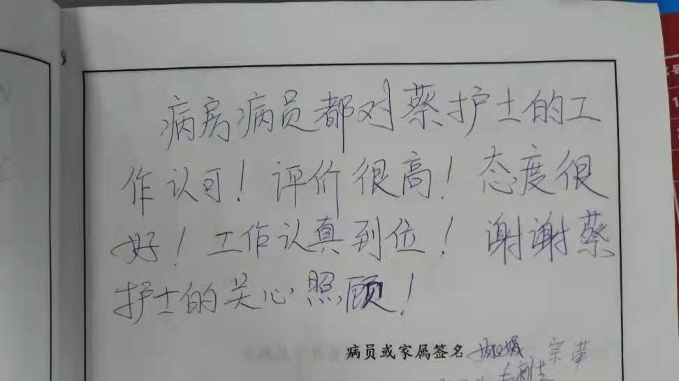“金杯銀杯不如百姓口碑”,每一段留言都藏着一段感動人心的故事,每一個故事都是蔡護士用心踐行優質護理服務理念結出的果實。像這樣的事,蔡護士經曆過很多次,每一位病人的感謝對蔡護士而言,不僅是沉甸甸的一份榮譽,更是她工作不斷進步的動力。