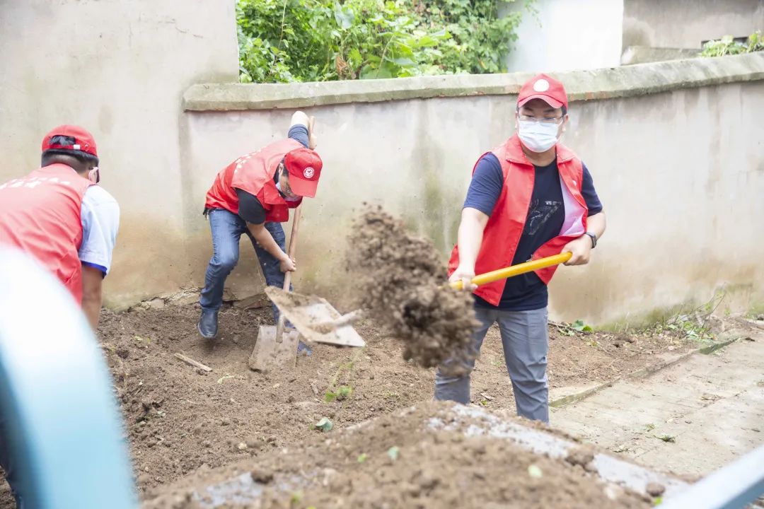 清理現場,志願者們将菜地中的菜、牆上的藤蔓徒手拔除幹淨,再用鐵鍁将土地松動,運走多餘的泥土。前一天夜裡的暴雨讓菜地濕滑泥濘,志願者們義無反顧站在泥上,将地裡的磚塊、木條刨出,方便下一步把土運走。由于菜地地處斜坡,可供站人的地方有限,志願者們采取接力方式,不停歇地把一鍬鍬土鏟送到運輸車上。志願者們上衣被汗水濕透,褲腳、鞋子沾滿了泥,但他們毫不在意,專心清理着菜地。