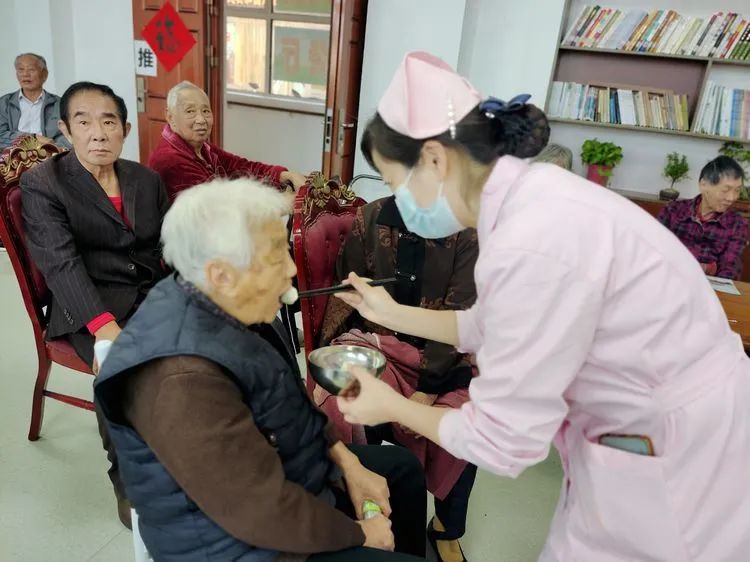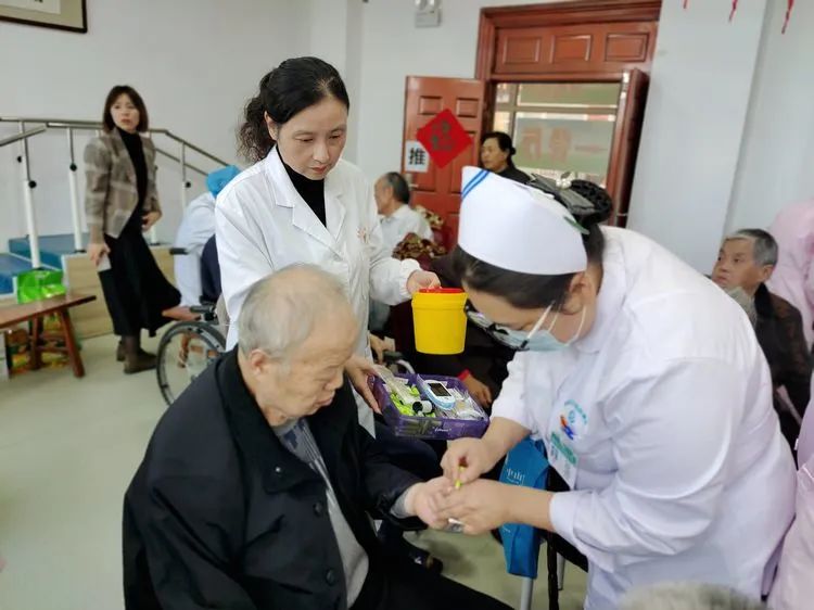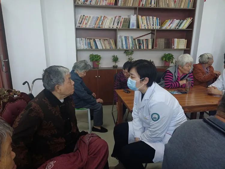 在康健養老院金年会体育總院内科黨總支的黨員們為老人們量血壓,測血糖,宣講老年疾病的防治知識。