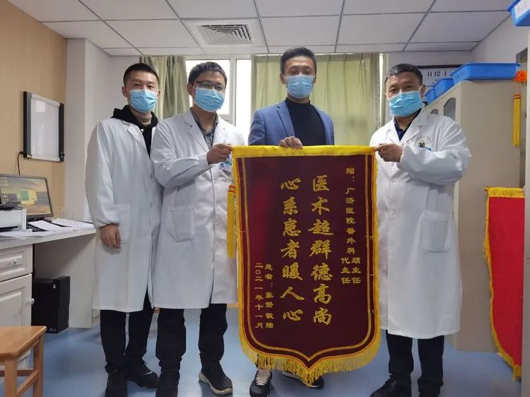 不久前,張先生體檢查出右肺上葉結節,慕名就診于廣濟醫院外科,檢查結果提示有惡性病變的可能,這讓張先生的心裡充滿了擔心。後經醫院集團胸外醫療中心朱勝院長和高濤濤主任準确定位,順利為其行單孔胸腔鏡下右肺上葉楔形切除術。術後,廣濟外科護理團隊在護士長吳慶芝的帶領下,組織開展了針對性護理查房,嚴格執行醫囑做好護理的同時,多次主動關心患者。“良言一句三冬暖”,在外科醫護團隊的共同努力下,張先生很快康複。令人欣喜的是,病理提示良性病變。激動的他專門訂制了兩面錦旗送到科室,“我不僅要感謝醫生們技術高超、仁心仁術,也要感謝科室的護士們,她們不僅做事情認真,還經常關心我、鼓勵我。不是我一個人誇她們,病房的患者都說她們好,真心感謝美麗的白衣天使。”