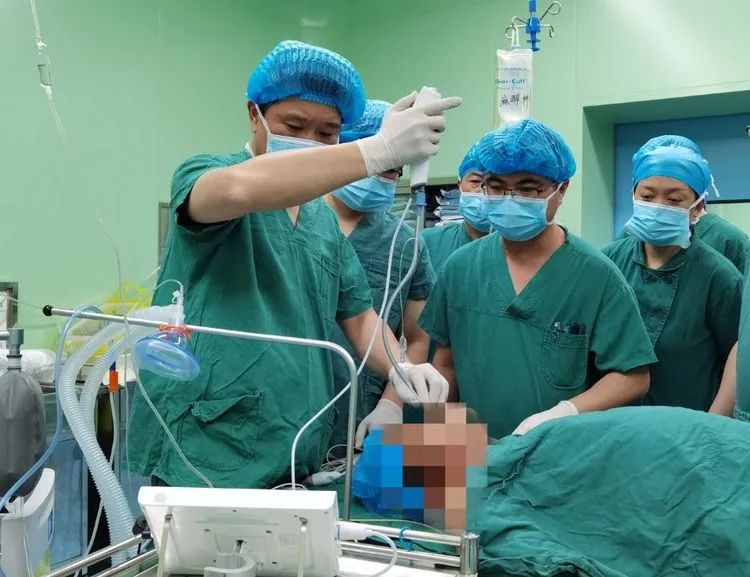 很快,手術的日子到了。由于腫瘤壓迫大氣道,氣管受壓嚴重偏移,常規的麻醉誘導插管有窒息風險,所以麻醉難度高,對此麻醉科為其制定了清醒插管的方案。集團麻醉醫療中心劉侖院長親自上陣,于纖支鏡引導下順利為其行氣管插管。麻醉滿意後,在省腫瘤醫院專家指導下,東方普外醫療團隊逐層分離、暴露腫瘤、保護血管和神經,伴随着他們雙手熟練的遊走,離斷組織、結紮縫合,手術順利結束,術中出血僅50ml。