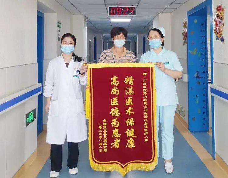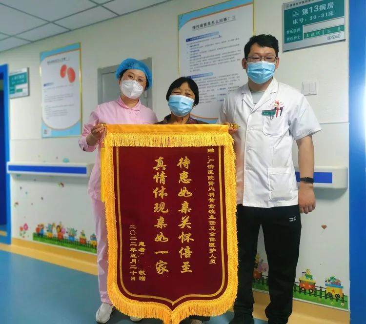 就診廣濟醫院腎内科,是因為老人“認識”黃金波主任。黃主任帶領團隊為其完善檢查後,明确診斷為“慢性腎髒病5期、血液透析、腎性貧血、腎性骨病;肺部感染;心功能Ⅲ級;冠心病;高血壓3級(極高壓);2型糖尿病”,随後為老人進行了中心吸氧,血液透析,抗感染,糾正貧血,強心,降壓,保心,補鈣降磷,止咳化痰等對症治療,老人不适症狀很快好轉,出院之際奉上一面錦旗:待患如親關懷備至真情體現親如一家。